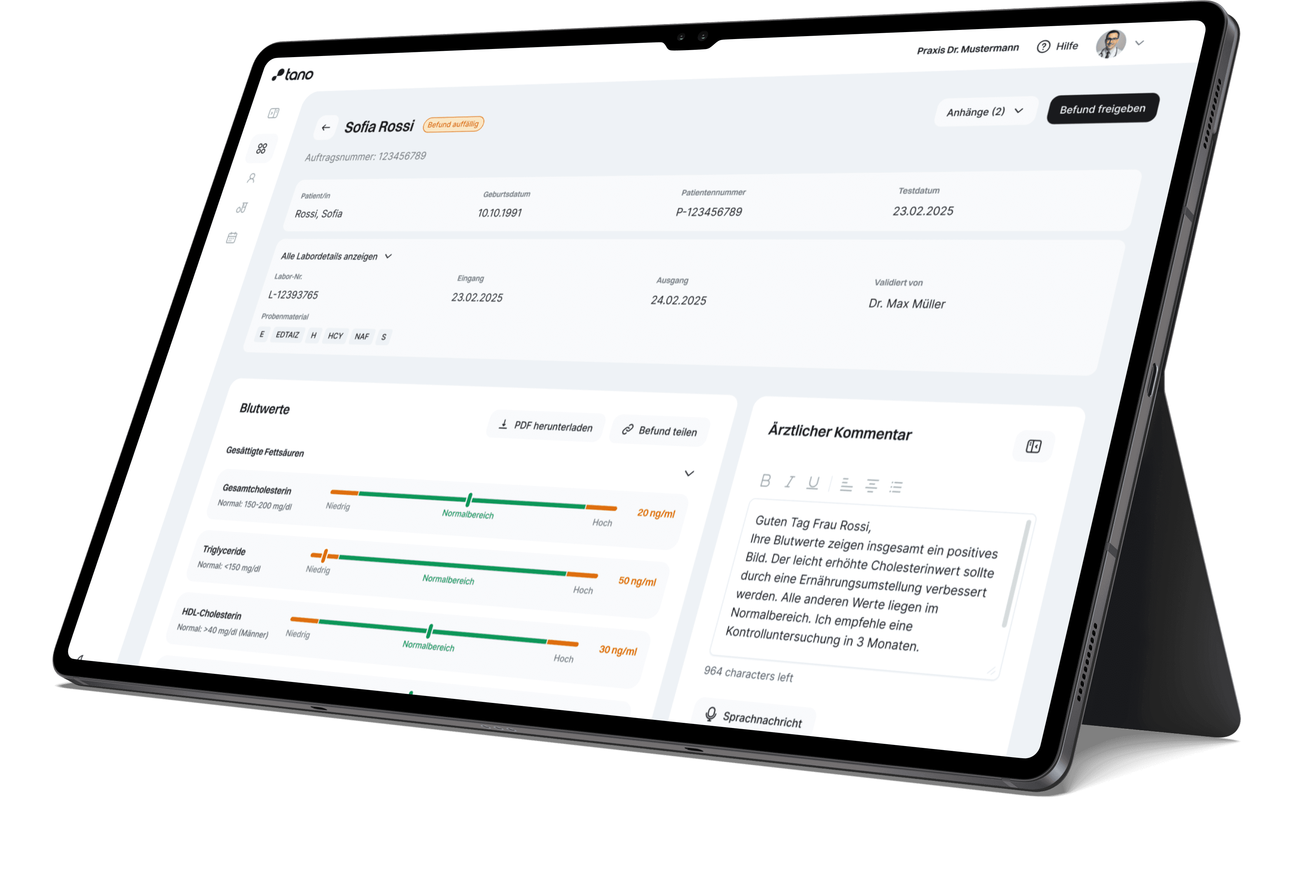 tano integriert sich nahtlos in bestehende LIS-Strukturen oder ermöglicht alternativ den unkomplizierten Befund-Upload. Cloudbasiert und geräteunabhängig unterstützt die Plattform Ihre Praxis ohne zusätzliche IT-Komplexität.