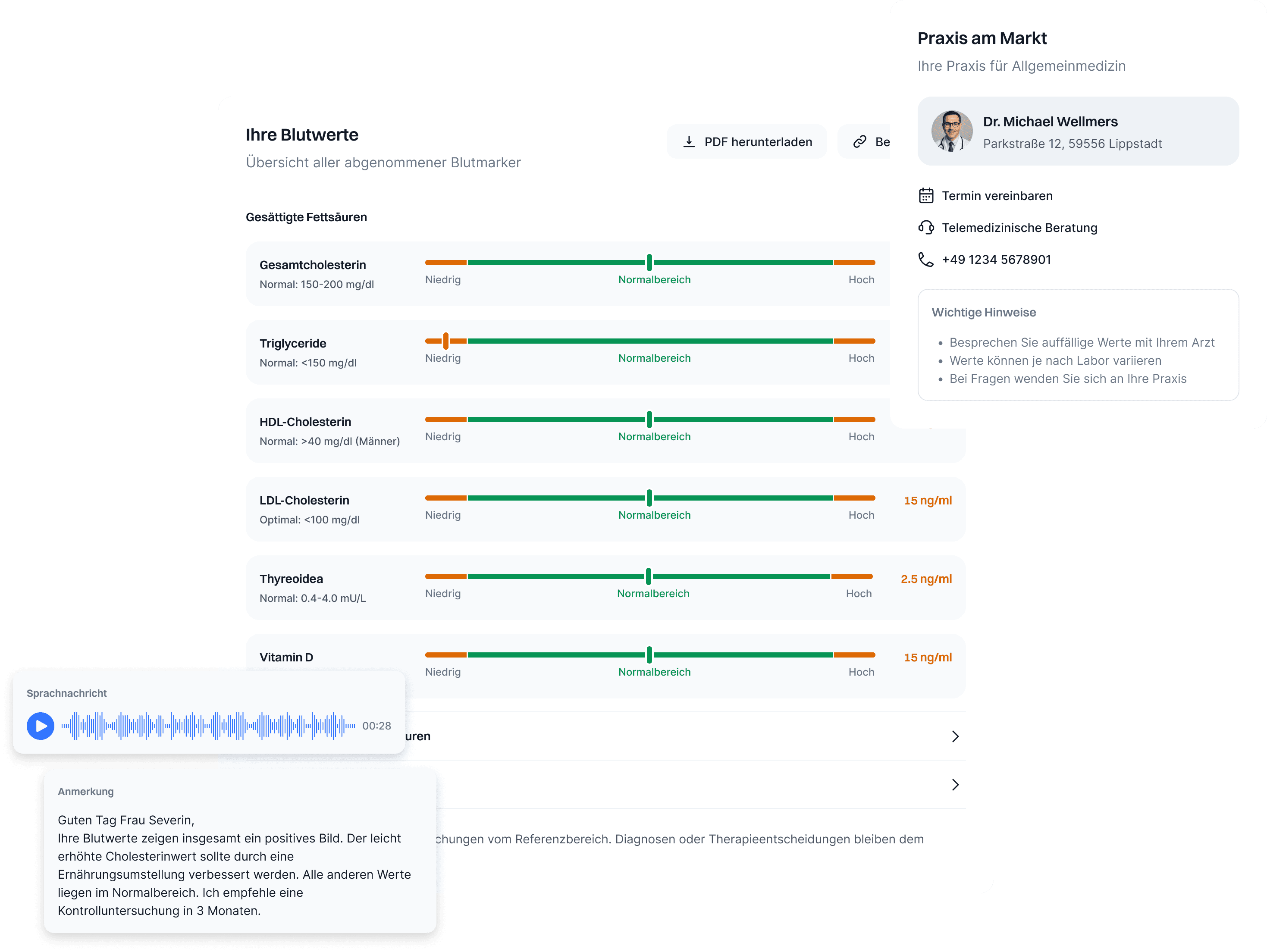 Übermitteln Sie Laborbefunde geräteunabhängig, sicher und ohne zusätzlichen Verwaltungsaufwand direkt an Ihre Patient:innen. Sparen Sie Telefonate und nutzen Sie Sprach- oder Textmemos für eine schnelle, strukturierte Kommunikation.